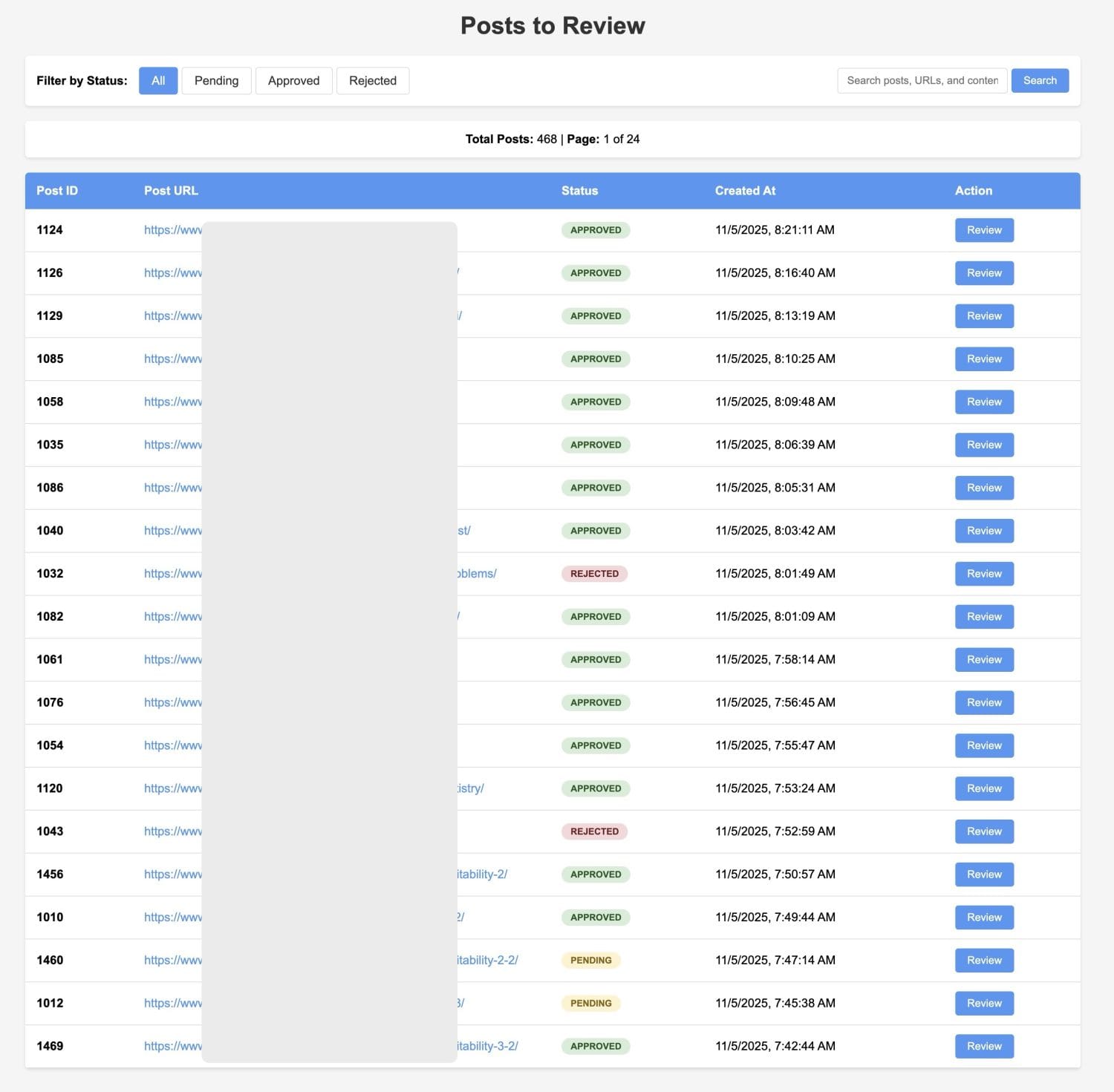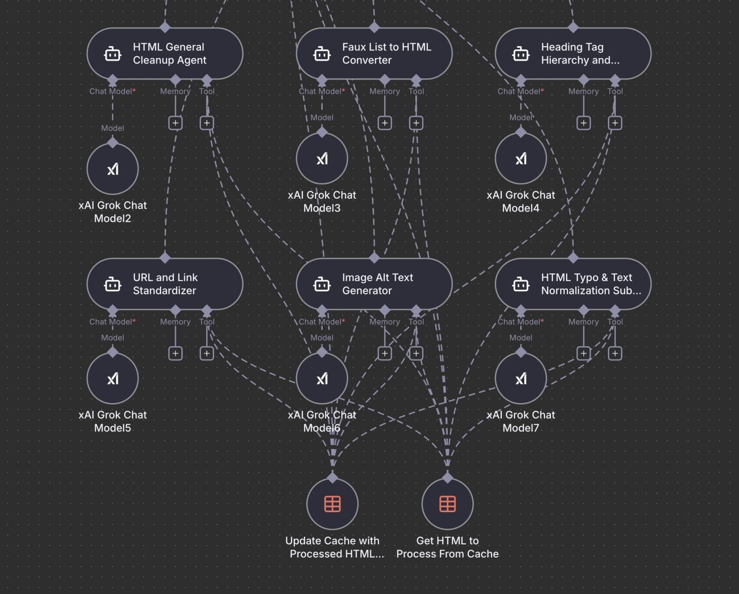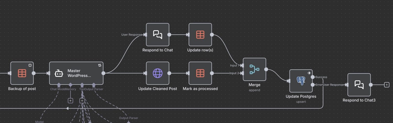 TL;DR — We built an n8n workflow that pulled ~470 posts (15 years of content) from a WordPress site, ran each post through a chain of focused AI sub-agents (HTML cleanup → headings → URL normalization → list fixes → image alt text → typo pass), logged every action to a database, and pushed cleaned HTML back to WordPress. I also built a small JS review app (with Windsurf) to diff original vs AI-edited content so a human can accept/reject changes. Accuracy landed around 85–90% on first pass. Next, I’m gating the “update in WP” step until a human approves. Below is what it took, how it works, and how you can adapt it.